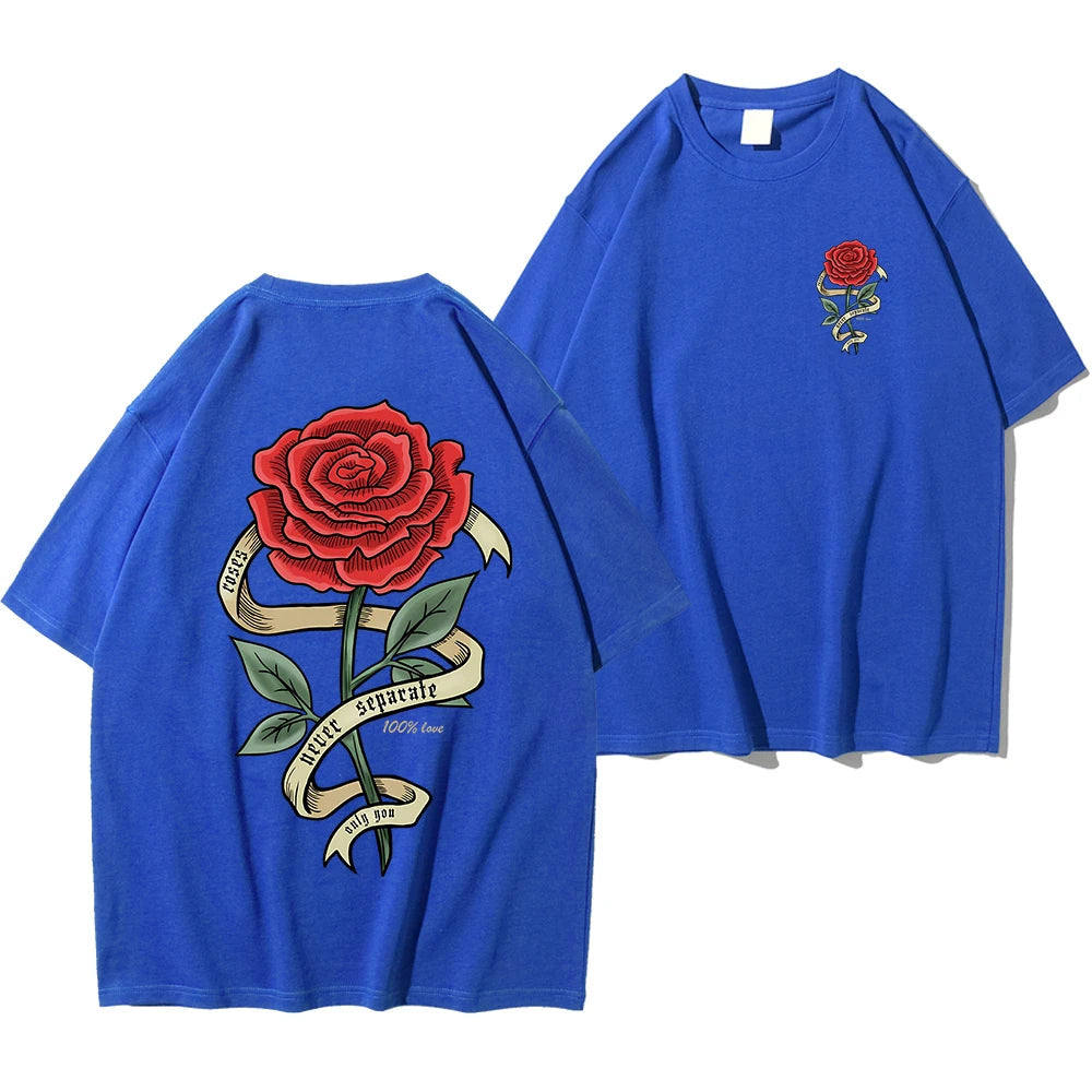 Featuring a striking red rose and banner design on the back, this shirt adds an edgy touch to your look. Crafted from soft, breathable cotton, it’s as comfortable as it is stylish, perfect for everyday wear.