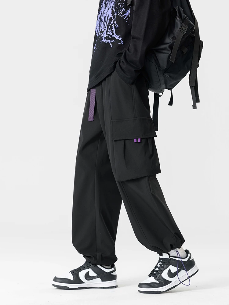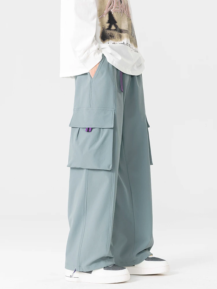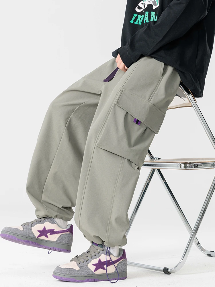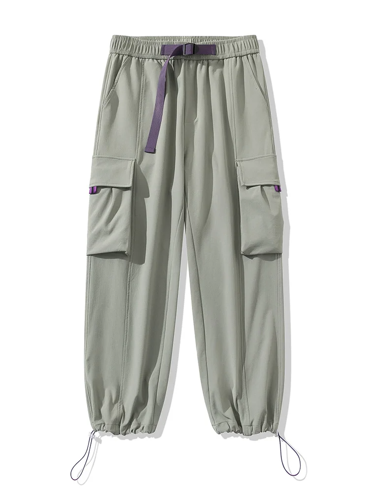 These wide-leg cargo pants offer a breathable, slightly stretchy fit with an adjustable buckle waist and drawstring cuffs for a fully customizable look. Deep cargo pockets add utility, while the structured yet relaxed fit makes them perfect for cooler seasons.