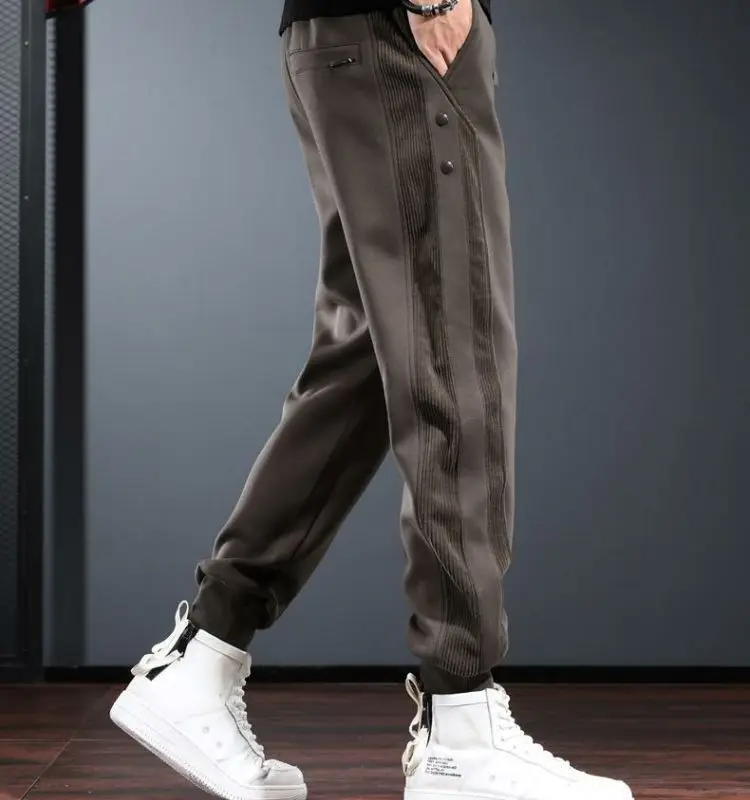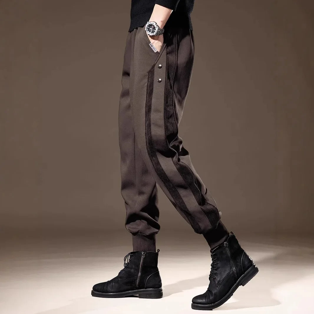 Crafted from stretch-enhanced performance knit, these joggers flex with every step while maintaining a tailored fit. Reinforced ribbed side panels and snap-button accents add rugged detail—ready for city runs, travel, or commanding a night out.
