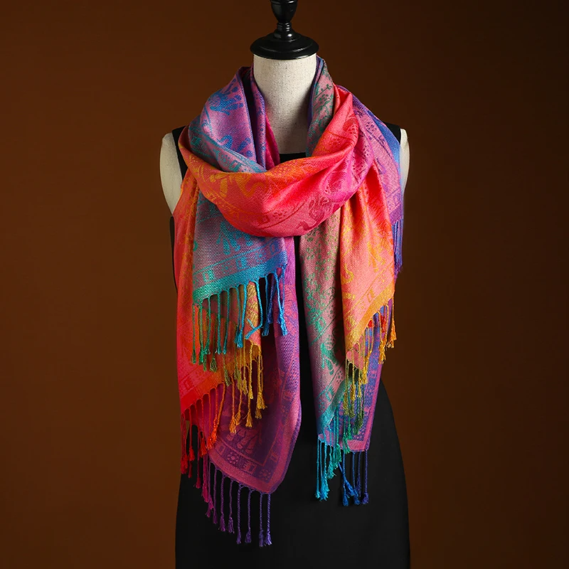 Crafted with a hand-loomed look and a gradient that melts from jewel-toned dusk to deep twilight, this shawl wraps you in warmth and wonder. Soft, breathable, and impossibly vibrant, it turns a simple outfit into a statement of culture and color.